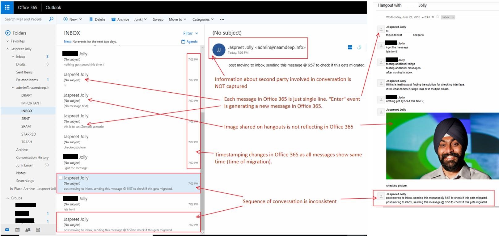 Once this is done, mailbox migration process can move the chats as individual emails to Inbox. Although we can get the Hangout Chats to Office 365 mailbox but following are few observations which may not be acceptable to customers.